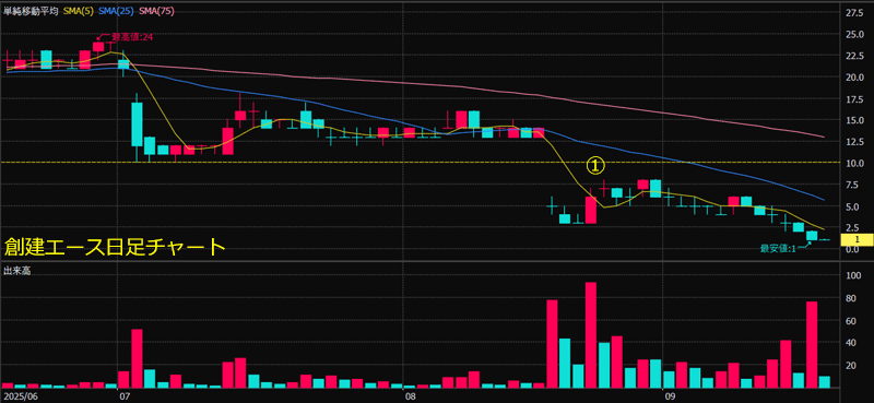 創建エースの株主の中には上場廃止リスクを避けて、すでに売却済みの方もいらっしゃるでしょう。7月1日、2日には株価が急落し、安値10円をつけています。
