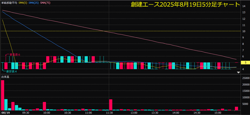 8月18日の終値は14円でした。取引開始直後は売り注文が殺到し、9時3分に5円で寄り付きます。直後に安値4円をつけ、9分に高値6円までリバウンドします。