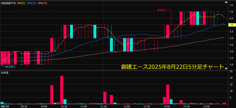 マネーゲーム1回目。オルツの株価急騰で創建エースにも短期資金が流入します。創建エースは10時から株価が上がり始めました。順調な右肩上がりが続き、14時10分に高値7円をつけます。