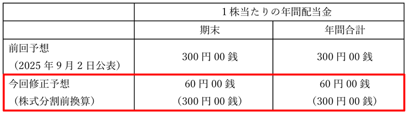 2026年7月期の期末配当は株式分割後の株数に基づいて計算されます。これは、分割前の1株あたり300円を、分割後の株数に合わせて1株あたり60円に修正したもので、実質的には同額となります。