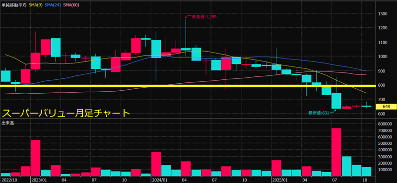 チャート画像に惹かれた黄色の線は、今回のTOB価格795円を示しています。この水準より安く購入した株主は含み益、高く購入した株主は含み損となります。スーパーバリューの上場廃止が決定すれば、保有株式の売却によって株主の損益が最終的に確定します。