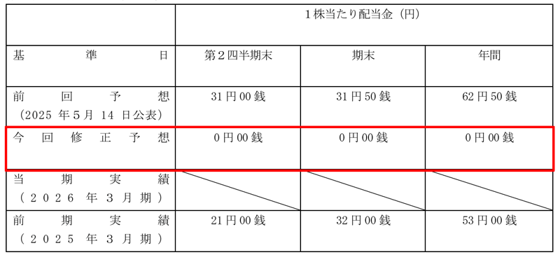 2026年3月期の中間配当と期末配当については無配が決定しました。TOB価格1,710円が配当を実施しないことを前提に決定しているためです。