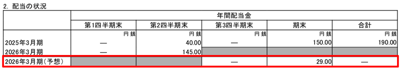 2026年3月期の中間配当(9月末権利確定済み)は、株式分割前の株数に基づき1株あたり145円で決定済みです。