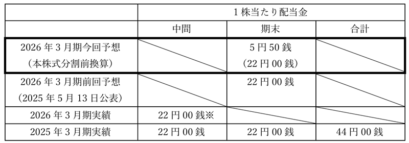 2026年3月期の中間配当(9月末権利確定済み)は株式分割前の株数に適用され、1株あたり22円に決定済みです。