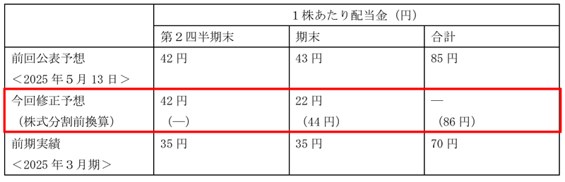 2026年3月期の中間配当(9月末権利確定済み)は株式分割前の株数に適用され、1株あたり42円に決定済みです。