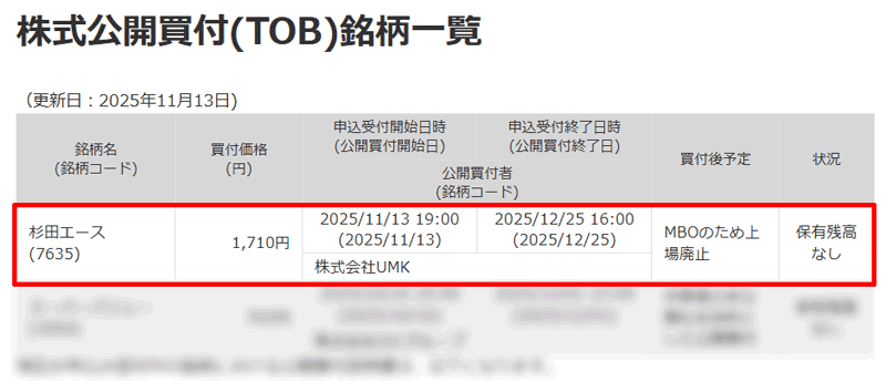 親会社として新たに設立された株式会社UMKが、経営陣等の賛同を得て株式をすべて買い取って非公開化するため、杉田エースは上場廃止となる予定です。