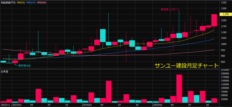 TOB価格の1,600円は、2025年5月の高値である1,278円を大きく上回る水準です。これにより、多くの株主にとって有利な価格で利益を確定できる状況となります。サンユー建設の上場廃止が決定することで、株主は保有株式の売却により最終的な損益を確定させることになります。