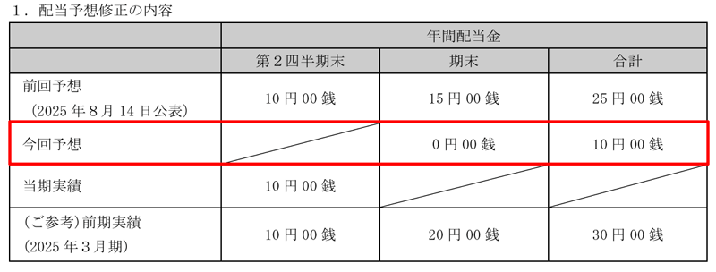 2026年3月期の期末配当については、TOB成立を条件に無配となる予定です。TOBが不成立となった場合は、配当が再度検討される可能性があります。