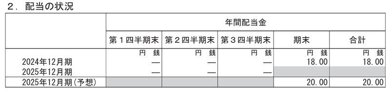 2025年12月期の期末配当については、株式分割前の株数に基づき、1株あたり20円を予定しています。期末配当の権利を得るには、権利付き最終日である2025年12月26日(金)までに株式を保有している必要があります。