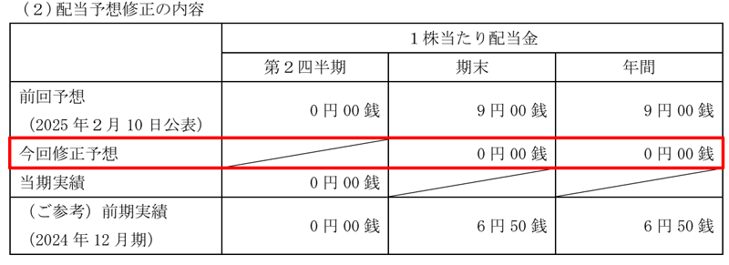 2025年12月期の期末配当については、TOB成立を条件に無配となる予定です。TOBが不成立となった場合は、配当が再度検討される可能性があります。