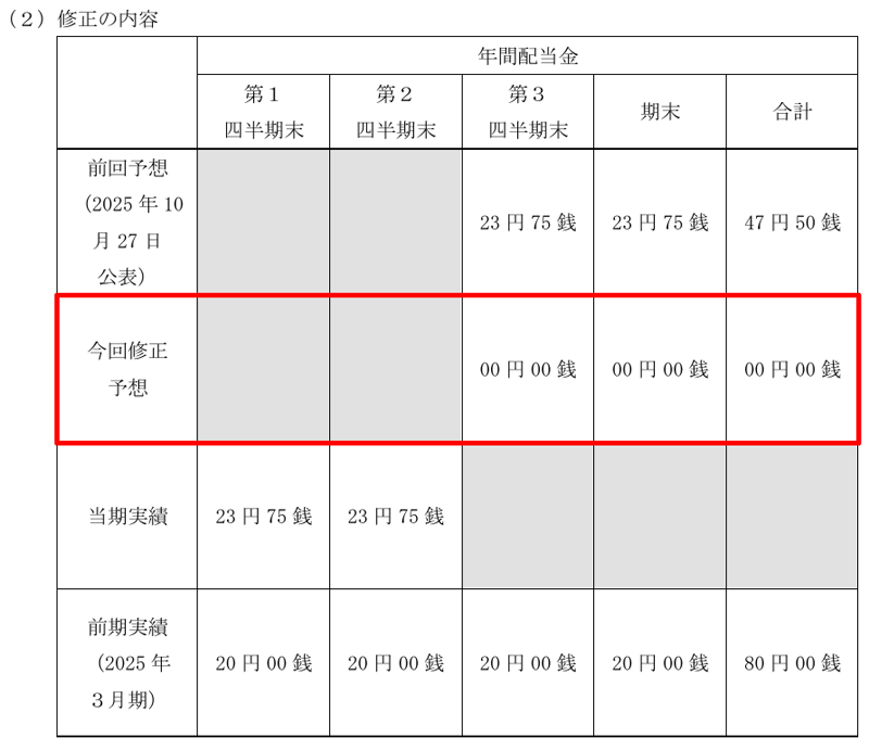 2026年3月期の第3四半期配当と期末配当については、TOB成立を条件に無配となる予定です。TOBが不成立となった場合は、配当が再度検討される可能性があります。