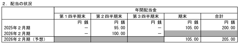 2026年2月期の期末配当については、株式分割前の株数に基づき、1株あたり105円を予定しています。期末配当の権利を得るには、権利付き最終日である2026年2月18日(水)までに株式を保有している必要があります。