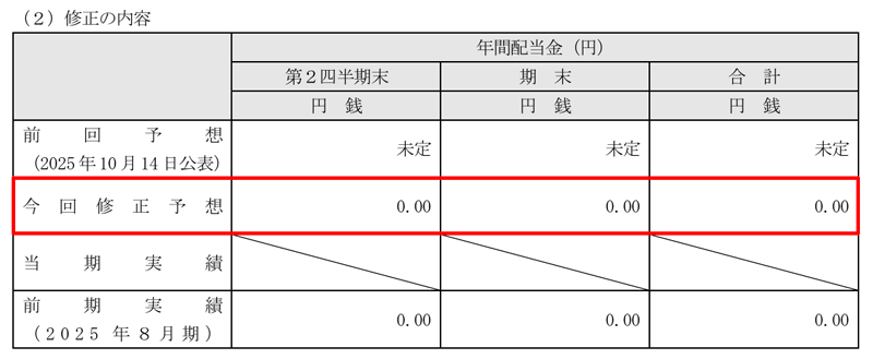 農業総合研究所は8月決算企業です。2026年8月期の配当(中間・期末)については、TOB成立を条件に無配となる予定です。