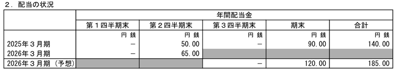 2026年3月期の期末配当については、株式分割前の株数に基づき、1株あたり120円を予定しています。期末配当の権利を得るには、権利付き最終日である2026年3月27日(金)までに株式を保有している必要があります。