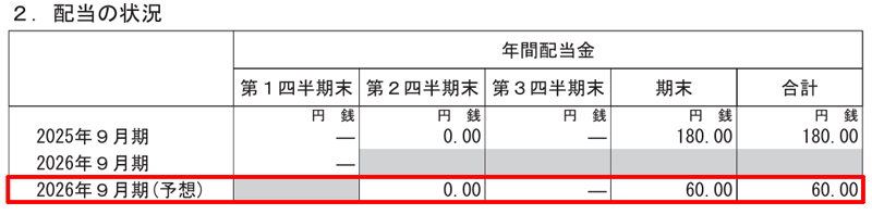 2026年9月期の期末配当については、株式分割後の株数に基づき、1株あたり60円を予定しています。これは株式分割前に換算すると1株あたり180円に相当し、実質的な変更はありません。
