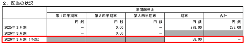 2026年3月期の期末配当については、株式分割後の株数に基づき、1株あたり58円を予定しています。これは株式分割前で換算すると、1株あたり290円に相当し、実質的な増配となります。期末配当の権利を得るには、権利付き最終日である2026年3月27日(金)までに株式を保有している必要があります。