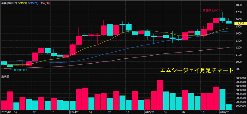 TOB価格の2,200円は、2026年1月の高値である1,700円を大幅に上回る水準です。これにより、多くの株主にとって有利な価格で利益を確定できる状況となります。MCJの上場廃止が決定すれば、保有株式の売却によって株主の損益が最終的に確定します。