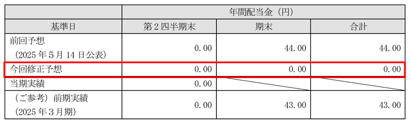 2026年3月期の期末配当については、TOB成立を条件に無配(0円)となる予定です。TOBが不成立となった場合は、配当が再度検討される可能性があります。
