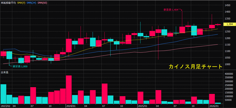 TOB価格の2,285円は、2025年8月の高値である1,404円を大幅に上回る水準です。これにより、多くの株主にとって有利な価格で利益を確定できる状況となります。カイノスの上場廃止が決定することで、株主は保有株式の売却により最終的な損益を確定させることになります。