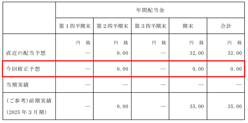 2026年3月期の期末配当については、TOB成立を条件に無配となる予定です。不成立となった場合は、配当が再度検討される可能性があります。