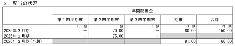 2026年3月期の期末配当については、株式分割前の株数に基づき、1株あたり91円を予定しています。期末配当の権利を得るには、権利付き最終日である2026年3月27日(金)までに株式を保有している必要があります。