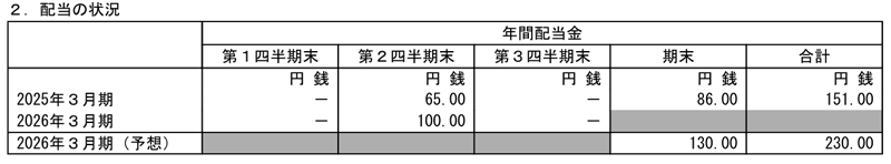 2026年3月期の期末配当については、株式分割前の株数に基づき、1株あたり130円を予定しています。期末配当の権利を得るには、権利付き最終日である2026年3月27日(金)までに株式を保有している必要があります。