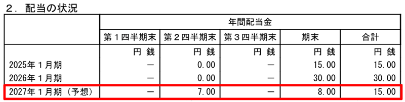 2027年1月期の配当は株式分割後の株数に基づいて計算され、中間配当は1株あたり7円、期末配当は1株あたり8円を予定しています。株式分割前で換算すると、中間配当が1株あたり21円、期末配当は1株あたり24円の計45円です。