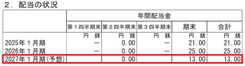 2027年1月期の期末配当は株式分割後の株数に基づいて計算され、1株あたり13円を予定しています。分割前で換算すると、1株26円に相当します。期末配当の権利を得るには、2027年1月27日(水)の取引終了時点で株式を保有している必要があります。