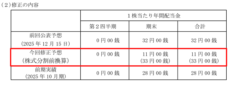 2026年10月期の配当は株式分割後の株数に基づいて計算され、1株あたり11円を予定しています。分割前で換算すると1株33円に相当し、前回予想に比べて1円増配となります。